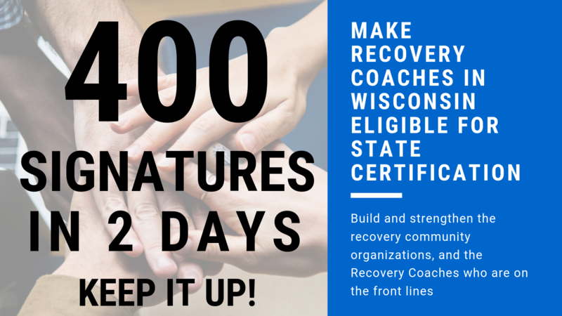 Petition updateRecognize Recovery Coach training for certification in the state of Wisconsin.Over 400 signatures in two days! Keep it up!