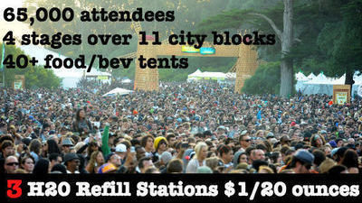 Other music festivals, including The Governors Ball, Lollapalooza, and Austin City Limits, already provide free refillable water in the name of SAFETY and SUSTAINABILITY...why shouldn't Outside Lands??
