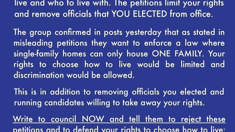 This weekend, the STOP group has posted confirming that, as in misleading petitions distributed to residents, they want to enforce a law where only ONE FAMILY is allowed to live in a single-family home. This is in addition to removing from office officials that YOU ELECTED and running candidates who will take away your rights. All of this is being discussed at council TONIGHT.