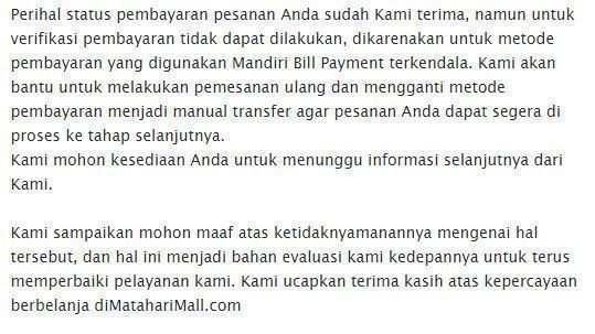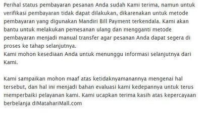Saya membeli sebuah produk di Mataharimall.com (PT Solusi ecommerce global), order saya menggunakan sistem multipayment tapi karena gangguan, saya bertanya ke Costumer Service apakah boleh menggunakan Transfer manual? CS menjawab bisa, nanti akan di forward ke bagian finance dan akan dikonfirmasi, saya segera transfer manual, setelah itu saya kirim ke CS.