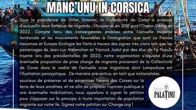 De manière préventive, en tant que nationalistes soucieux de préserver et de pérenniser l'avenir des Corses sur la terre de leurs ancêtres, et ce afin de préparer l'opinion publique à une éventuelle mobilisation, nous appelons à signer la pétition pour s'opposer sur le principe à toute importation de population migrante sur notre île.