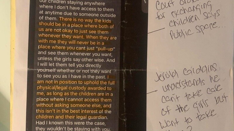 This text was sent from the father to mom. The father understands he cannot uphold the physical legal custody awarded to him. Yet, he gets mad because I made it clear, he had to pick children up from a public space and not my home due to him making accusations at the children's school about them having psychological issues and trouble at home.