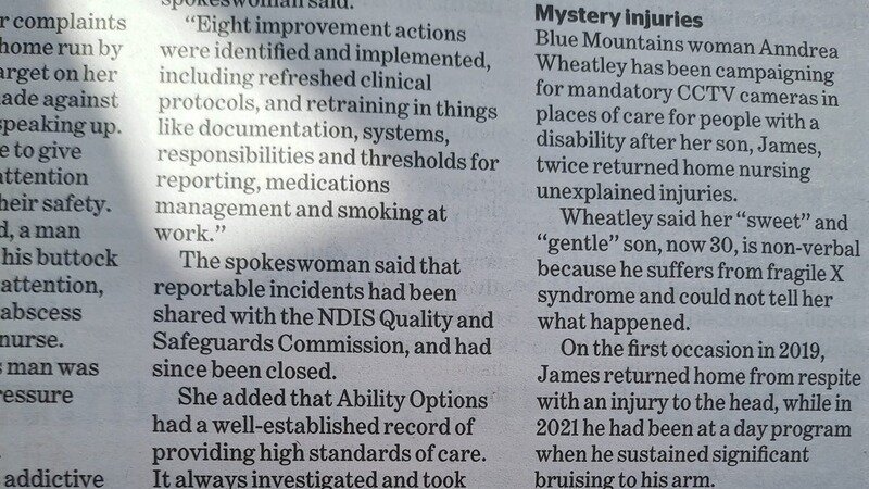 An article on the terrible things happening in disabilities has been put up by Carrie fellner of Sydney Morning Herald yesterday 4th March 2025 I was surprised as had talked to her a long time ago when she called me. James is mentioned and what happened to him at a respite house and day program in the Blue Mountains those providers refused to be accountable and were not made accountable and without CCTV we will never get the protection and justice our precious vulnerable children will need all their lives. We need to make providers always accountable and the NDIS remains also culpable for what goes on in disability care.