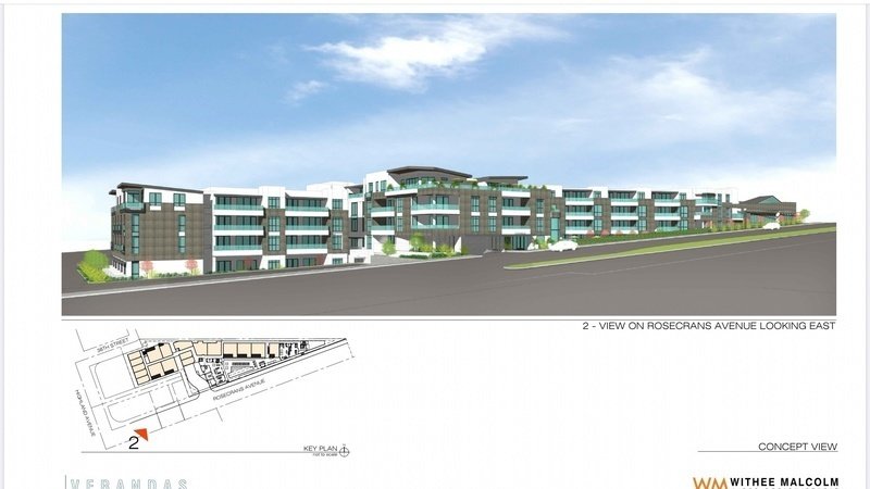 A 79-unit, 4-story apartment project at Highland and Rosecrans that, at 50’ tall, would dwarf the surrounding neighborhood has been submitted to the City for fast tracked approval. The applicant has requested that the building exceed the 30’ building height limit by 20’! That is a 50’ building that will significantly impact the surrounding homes and businesses.