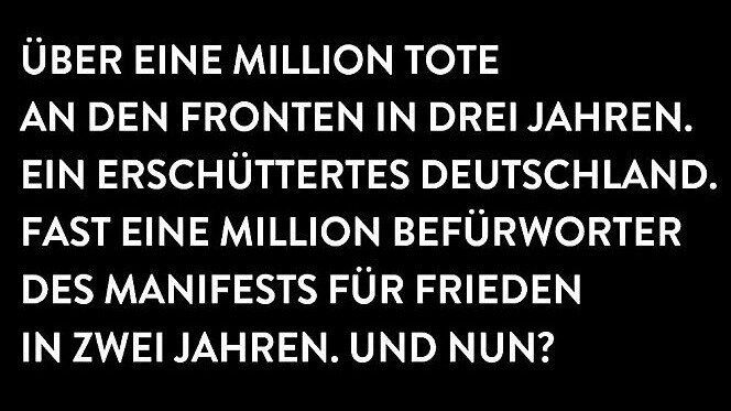 Über die Hälfte der deutschen Bevölkerung ist seit langem für Verhandlungen. Das belegen immer wieder die Umfragen. Doch sie hatten keine Stimme in den Medien. Unser Manifest durchbrach das Schweigen. Endlich wurde öffentlich und kontrovers debattiert. Doch jetzt wird wieder geschwiegen. Wahlkampf. Darum hier noch einmal der Text. 935.000 haben schon unterschrieben. Zur Million sind es nur noch wenige Schritte. - Nachfolgend das so heftig kritisierte Manifest im Wortlaut: