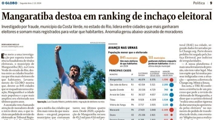 Hoje o jornal oGlobo publicou uma matéria (em anexo), mostrando que as fraudes com transferências irregulares de títulos não é novidade em Mangaratiba. E também está mostrando, principalmente, a nossa indignação por essa situação que foi manifestada através da Change.org, indignação essa que agora é de conhecimento do Ministério Público Eleitoral e do Tribunal Superior Eleitoral.