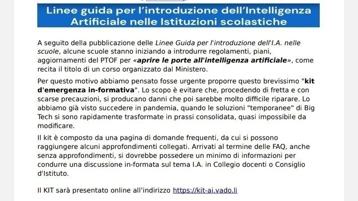 Invitiamo tutti a partecipare al webinar del 28 gennaio, una seria riflessione con esperti qualificati su cos'è l' "intelligenza artificiale" e sui rischi della sua introduzione acritica a scuola (cfr. https://cobasscuolapalermo.com/2026/01/21/28-gennaio-presentazione-del-kit-sulli-a-a-scuola/).