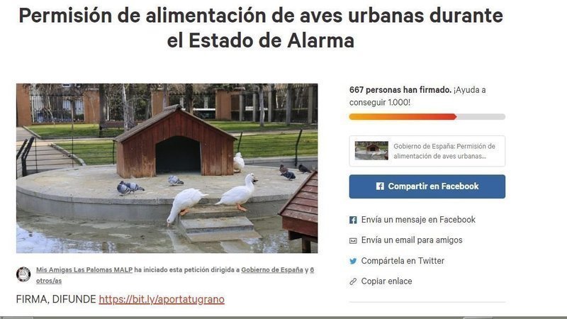 Con esta petición pedimos que durante el estado de alarma se permita a los ciudadanos tanto alimentar a las anátidas de ´´ornato´´ como a las palomas y gorriones. Mientras los ciudadanos lo hacen como pueden, con agobio y ansiedad, siendo testigos de como los animales sufren.