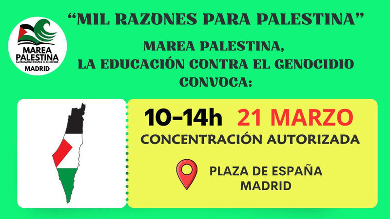 El próximo 24 de marzo de 2026 se votará finalmente en la Comisión de Cooperación Internacional para el Desarrollo del Congreso de los Diputados (y no en la Comisión de Asuntos Exteriores como inicialmente se preveía) la Proposición No de Ley presentada por el grupo parlamentario Sumar, respondiendo a la propuesta enviada a todos los grupos parlamentarios presentada por Marea Palestina el pasado mes de diciembre de 2025 para que el gobierno español destine mil millones para Palestina a través de la transferencia de mil millones de euros a UNRWA (Agencia de Naciones Unidas para los Refugiados de Palestina en Oriente Próximo). Aunque la cantidad puede parecer elevada, es la recaudada por el estado a raíz del sorteo de la lotería de Navidad y la prometida como ayuda militar por el gobierno español a Ucrania. Por lo tanto, dinero hay, pero lo que se debe plantear es si preferimos un uso del mismo para la paz y solidaridad o para la guerra...