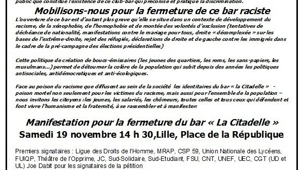 Face au poison du racisme que diffusent au sein de la société les identitaires du bar « la Citadelle » - poison mortel non seulement pour les victimes du racisme, mais aussi pour l’ensemble de la population – nous invitons les citoyens :les jeunes, les salariés, les chômeurs, toutes celles et tous ceux qui défendent et font vivre l’humanisme et la fraternité, à se rassembler et à manifester: