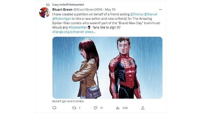 The first petition asks Marvel Comics to get Peter Parker and Mary Jane Watson back together as a couple and remarry in the monthly The Amazing Spider-Man comics. 955 total signatures have been collected so far and the petition can be found at this link: https://www.change.org/p/marvel-please-remarry-peter-and-mj