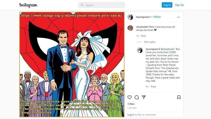 I recently shared a photo of this petition on my Instagram ( https://www.instagram.com/stuartgreen3/ ) and Marvel's Editor in Chief C.B. Cebulski replied, saying, "Peter's one true love will always be Gwen." I replied back with a quote by Peter Parker from "The Spectacular Spider-Man Annual" #8: "But I love you more than I EVER loved her. I love her and I miss her and she's dead. Gwen was my past, M.J. You're my future." It's so disappointing that so many people in charge of the current Spider-Man comics refuse to keep Peter and Mary Jane together. I sincerely hope that changes sooner rather than later and that Marvel gives the fans what they want: keeping Peter and Mary Jane together as a happily married couple.