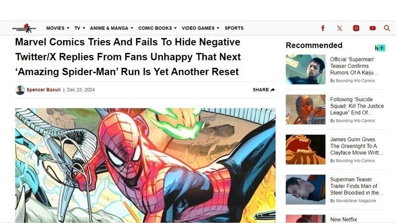 Ever since news broke of the new relaunch of "The Amazing Spider-Man" by writer Joe Kelly, websites such as Bounding Into Comics and Bleeding Cool have acknowledged that fans are unhappy with the book getting yet another relaunch and that Mary Jane Watson will NOT be in the book, moving instead to the monthly "Venom" comics, since Peter Parker is dating his new love interest Shay Marken. Bounding Into Comics also called out Marvel Comics for trying, and failing, to hide negative replies and comments on Twitter in regards to the backlash of "The Amazing Spider-Man" relaunch, which can be found here: https://boundingintocomics.com/comic-books/comic-book-news/marvel-comics-tries-and-fails-to-hide-negative-twitter-x-replies-from-fans-unhappy-that-next-amazing-spider-man-run-is-yet-another-reset/