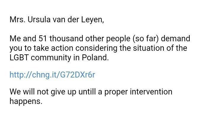 Me and [number of signatures] other people (so far) demand you to take action considering the situation of the LGBT community in Poland.