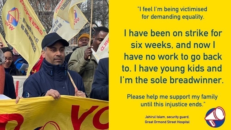 My colleague Jahirul, a security guard at Great Ormond Street Hospital, has lost his work there after our epic six-week strike for equality. He is being victimised for fighting for our rights!