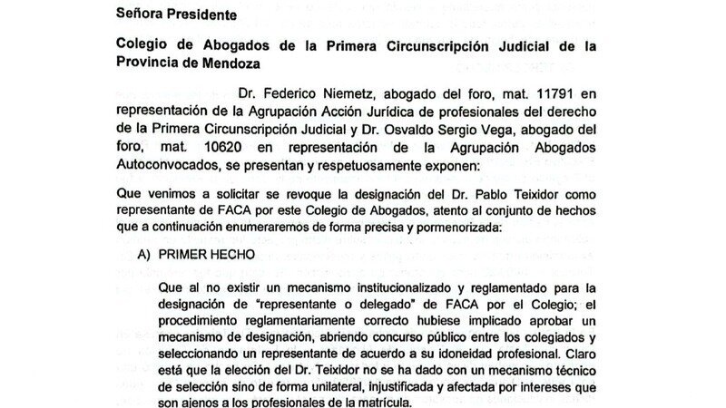 Que venimos a solicitar se revoque la designación del Dr. Pablo Teixidor como representante de FACA por este Colegio de Abogados, atento al conjunto de hechos que a continuación enumeraremos de forma precisa y pormenorizada: A) PRIMER HECHO