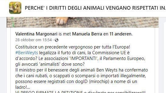 2) valse registraties in dogID (mogelijks ook catID en horseID) zijn sinds jaren schering en inslag, wat door Vlaamse Parlementsleden bevestigd werd. Ben Weyts legaliseert zo de diefstal van dieren. Justitie wordt onnodig overbelast, want als dogID zou werken zoals het hoort, dan zouden mensen geen klacht hoeven neer te leggen bij de politie. Ook het parket heeft zeker andere prioriteiten dan deze rommel op te moeten kuisen. De rechtbanken zijn onderbemand en sowieso niet in staat om het recht op een eerlijk proces binnen een redelijke termijn te respecteren. Het is absurd dat zij door voorkombare dierendiefstallen overbelast worden. Het emotioneel leed van diereneigenaars die hierdoor hun dier kwijtspelen, is enorm. In het buitenland gestolen dieren kunnen probleemloos en zonder enige controle in België worden geregistreerd. Vooral klachten uit Frankrijk en Nederland hebben me bereikt. Het kan niet langer zijn dat burgers duizenden euro's moeten spenderen om hun dieren (vaak zelfs niet) terug te krijgen door een falend beleid. De Vlaamse overheid kan aansprakelijk gesteld worden door duizenden slachtoffers, daar waar de oplossingen om dit te voorkomen snel, eenvoudig en goedkoop zijn.