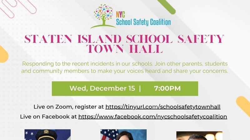 In response to recent incidents in our schools, please join parents, students, clergy, and community members for our Staten Island School Safety Town Hall Meeting tonight at 7:00PM.