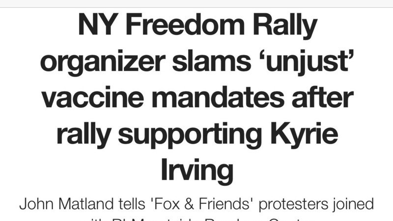 “Matland, who was fired after 15 years from his job in Staten Island as a CT scan technologist, said that the group's support of Irving will act as a "springboard" to spread the message that vaccine mandates are "unjust" and "affecting everybody."