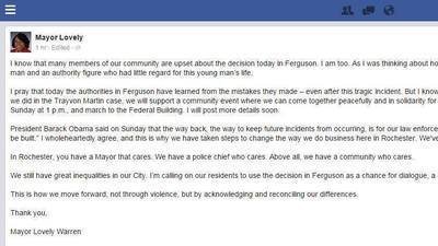 Mayor Lovely Warrens actions have not show to be the best interests of this city. From the starting days of her being mayor she was involved in controversy. Her latest actions concerning the call for a Protest march in Rochester NY concerning the grand jury decision from Ferguson Missouri and the promotion of the march is just not something a mayor should be associated with. Not a march for protest of any sort. She has disrespected her own officers and families by relating the Ferguson situation to a local officer here that was shot and killed. She has continued to make these situations racial and most of all promoted this all on the social media site Facebook. Facebook users comments were deleted by her and her post was continually edited as people voiced thier opinon.