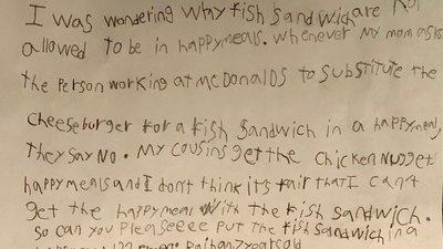 My cousins get the chicken nuggets meal and I don't think it's fair [just because I don't always eat meat], that I can't get the happy meal with the fish sandwich. So can you please put the fish sandwich with the happy meal too?