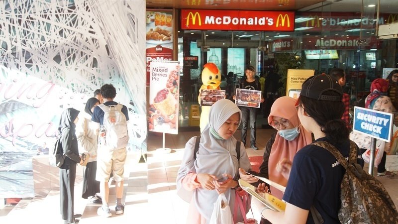 Pada Jumat, 11 Oktober 2019 sejumlah relawan melakukan edukasi dan aksi di depan salah satu gerai McDonald's di Yogyakarta. Relawan yang mayoritas perempuan, ya perempuan, menyuarakan penderitaan ayam petelur dalam rantai pasok McDonald's Indonesia.