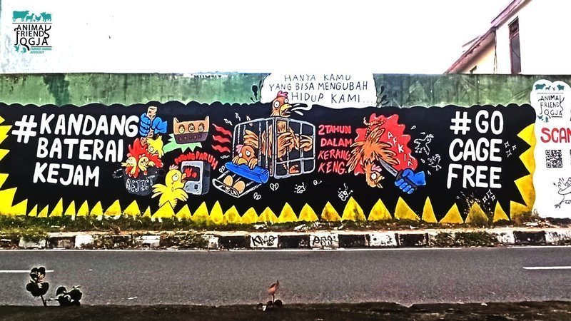 In early October 2021, Animal Friends Jogja (AFJ) together with the volunteers of Barisan Muda-Mudi Xayang Xatwa (BMXX) and the Act For Farmed Animals (AFFA) coalition made murals about "The Cruelty of Battery Cages" at two different locations in Yogyakarta to commemorate World Day for Farmed Animals which is celebrated on October 2 each year so that more people know that this is a very painful system for animals. The mural made by animal activists has a QR code that links people to the petition urging McDonald's Asia to announce a commitment to go cage-free throughout Asia Pacific.