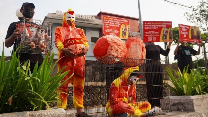 Sebanyak 14 aktivis perlindungan satwa dari Animal Friends Jogja (AFJ) memenuhi jalanan di depan gerai McDonald’s Sudirman, Yogyakarta, 31 Mei 2024 lalu, sembari membawa poster dan mengenakan kostum ayam. Aksi ini dilakukan untuk mendesak McDonald’s dengan permintaan yang sama, yaitu untuk segera menerbitkan komitmen bebas sangkar (cage-free).