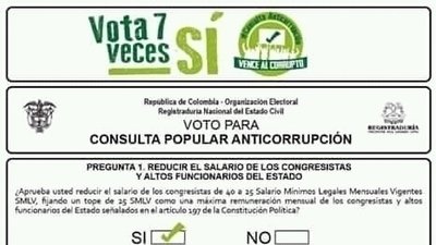 ¿Aprueba usted reducir el salario de los congresistas de 40 a 25 Salarios Mínimos Legales Mensuales Vigentes-SMLMV, fijando un tope de 25 SMLMV como máxima remuneración mensual de los congresistas y altos funcionarios del Estado señalados en el artículo 197 de la Constitución Política?