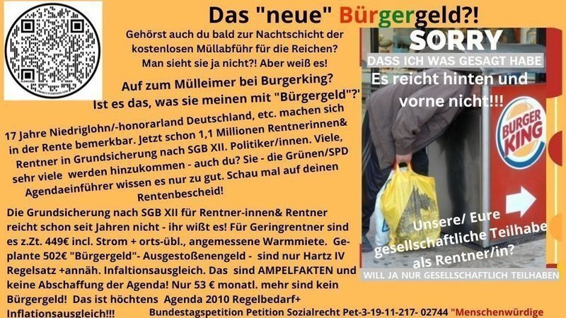 Was die Reform des Regelbdarfsermittlungsgesetzes, also die Berehcnung der notwendigen Höhe der Grundsicherung anbelangt, so sit das neue Bürgergeld in keinster Weise eine Neuerung der Ampel und deren so "sozialer Gesinnung", sondern vielmehr lediglich die Umsetzung der Urteils des Bundesverfassungsgerichts von 2014. 8 Jahre bevor die Damen und Herren die Rechtspsrechung des Obersten Gerichts umsetzen. Mehr an Gleichgültigkeit und nicht Respekt - Respektlosigkeit seitens eines seit langer Zeit amtierenden ehemaligen Finanzministers Scholz als auch eines seit Jahren amtierenden Sozialministers Hubertus Heil (beide SPD) kann woll kaum an den Tag gelegt werden!! Dagegen gilt es mit immer mehr Unterschribenden und einem heissen Herbst hinzuweisen!