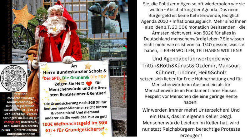 Sie wollen es immer noch nicht sehen, machen wir uns noch mehr bemerkbar und möge der Weihnachtsmann dieses Jahr nicht nur Geschenke für Wohlhabende bringen sondern diese erinnern: Wir sind alle Menschen eines Planeten und in Würde altern zu können, sollte ein Grundgesetz und Ziel westlich geprägter, statt dekadenter nur seinem eigenen Machterhalt dienender Lebensphilosophie sein.