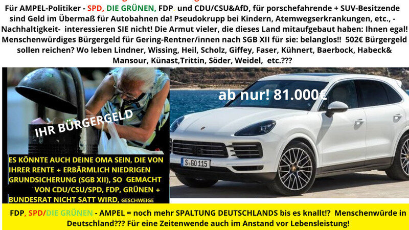 Was aber diese Bundesregierung, insbesondere die SPD und die agendaeinführenden Grünen, als auch die FDP machen ist seelisch derart erbärmlich: Ein Bürgergeld, das den Namen nicht verdient - gerade mal 502 € zum Leben für alles, auch wenn du 30 Jahre gearbeitet hast und deine Rente bei einem deutschen Rentneniveau von unter 50 % derart gering ist, dass du im Alter nur auf dieses erbärmliche Bürgergeld angewiesen bist.