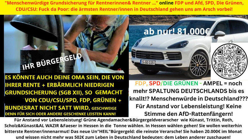 Bitterstes Bürgergeld in erbärmlicher Armut ist schon jetzt für mehr als 1,1 Millionen Renter/innen in Deutschland Realität. Abgeschoben zu den Tafeln und vor dem Fernseher sitzend - geselschafTliche TEILHABE NICHT ERWÜNSCHT UND finanziell schon gar nicht MÖGLICH1!