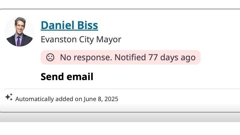 Before we continue, we’d like to make it clear that this is not an attempt to politicize this platform, or to wade into the congressional primary to succeed retiring Representative Jan Schakowsky. Rather it’s part of an ongoing effort to assess public engagement by elected officials who represent Evanstonians, as well as state officials in charge of regulatory efforts. Which leaders are making their voices heard? Which ones aren’t? And if not, why not?