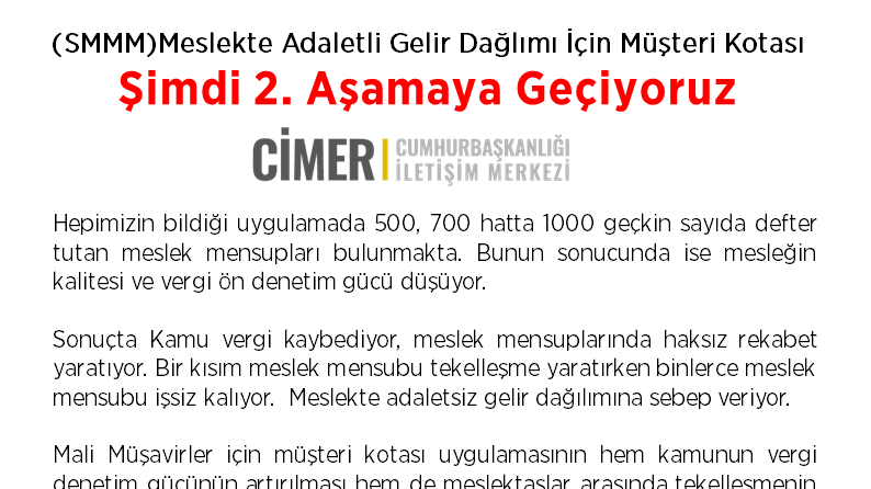 CİMER üzerinden (SMMM)Meslekte Adaletli Gelir Dağlımı İçin Müşteri Kotası Gelmeli başvurusu yapacağız. Her meslektaşımın CİMER üzerinden bu başvuruyu bireysel olarak gerçekleştirmesi mesleki geleceğimiz acısından büyük önem arz etmektedir.