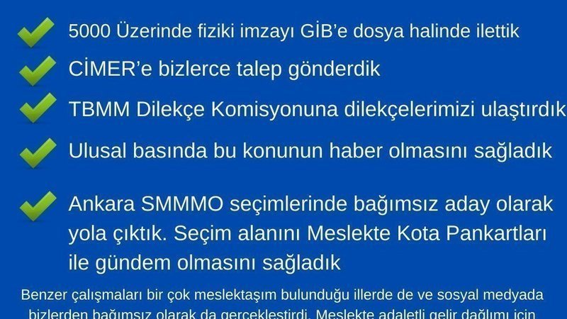 - Benzer çalışmaları birçok meslektaşım bulunduğu İllerde de ve sosyal medyada bizlerden bağımsız olarak da gerçekleştirdi. Meslekte adaletli gelir dağlımı için Meslekte Kota Talebimizi her alanda dile getirmeli, Mesleğimize sahip çıkmalıyız.