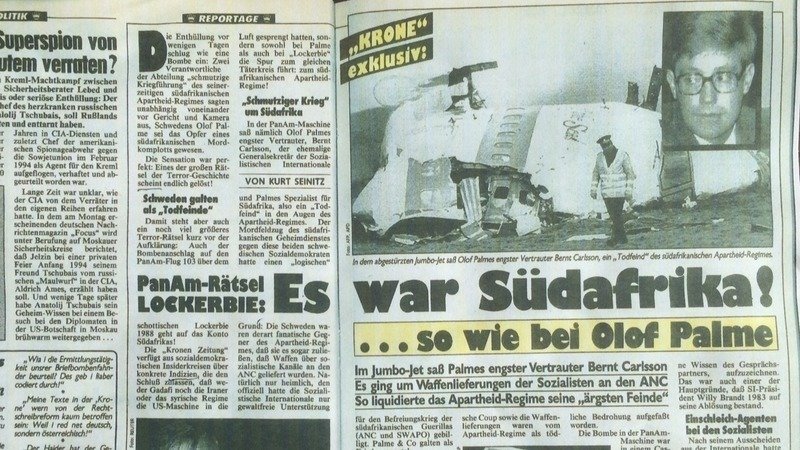 "Kronen Zeitung was given access to insider information from Sweden's Social Democratic Party which confirmed that it was neither Gaddafi, nor Iran, nor Syria that bombed the US jumbo jet, but instead that - as with Olof Palme as well as the Lockerbie bombing - the trail leads to the same plotters: the South African apartheid regime!