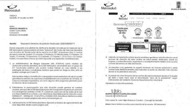 Обновление к петицииApertura de todos los Centros de Salud en Medellín con ampliación de servicios por COVID19Respuesta de MetroSalud frente a los Centros de Salud