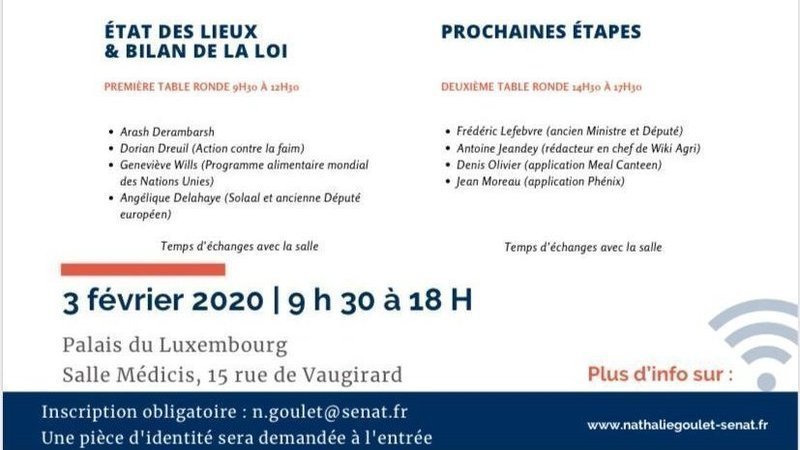 Pour fêter les 4 ans de la loi contre le gaspillage alimentaire, nous vous invitons au Sénat pour débattre et échanger ensemble à propos de la loi qui a été votée, sur son application et sur tout ce qui doit encore être fait.
