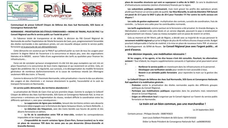 🔗 Contacts presse : Philippe Denolle : 06 88 74 58 23 Jean-Louis Dalibert (SOS Gares) : 07 87 14 16 32 Didier Le Reste (Convergence Nationale Rail) : 06 08 03 91 82