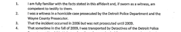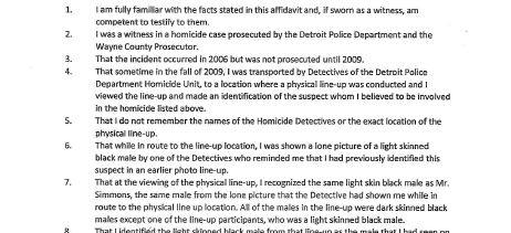 On June 28, 2006, on Detroit's Eastside, a man was fatally shot. Though people in the area gave statements to what they saw, no one stated they actually witnessed the shooting. Shortly after, Mr. Simmons was picked up, questioned about the homicide and released later that day. Nearly 4 months after the incident on Oct 24, 2006, witness H. Smith gave a statement to the homicide detective in charge of the case, stating he heard shooting, then saw a guy with a gun in his hand get into a car and drive pass him. The case went unsolved and placed into the cold case files for more than 3 years.