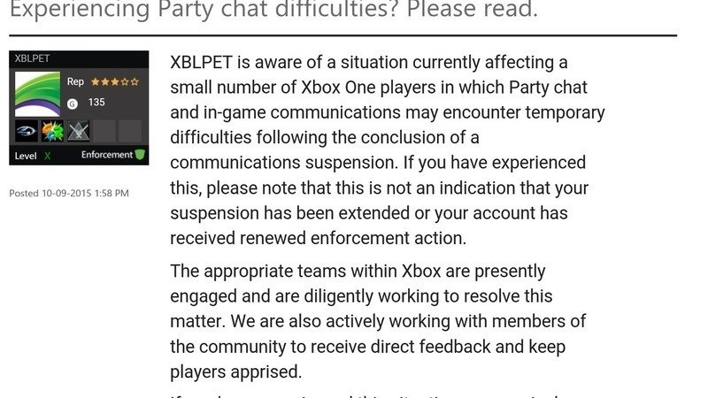 It is likely that thousands of people who have come out of a suspension on Xbox live are experiencing issues with communication. Everyone seems to have the same problem, where they can hear others in a party, but can not be heard. Some of these people, including myself, have gone weeks (maybe more) with this issue. Now, we have to pay for the full Xbox live service. And since this full service is not being provided, nor is anyone updating us on our issue, we demand that Microsoft and the XBLPET explain to the community what they are doing to fix the problem, and how they will be compensating us for not providing a full service in exchange for our money.