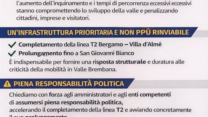 Il completamento e la messa in esercizio della linea T2 Bergamo – Villa d’Almè, così come il suo prolungamento verso l’alta Valle Brembana fino a San Giovanni Bianco, costituiscono interventi coerenti con tali indirizzi regionali e già riconosciuti come strategici per il riequilibrio territoriale e la mobilità sostenibile delle aree montane e periferiche.