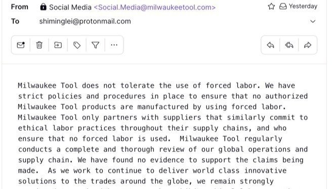 Milwaukee tool didn't react as any company who is responsible, instead, they arbitrarily denied their wrong behavior and ignored the sufferings of my family that my husband is Currently Working for Milwaukee as slave labor.