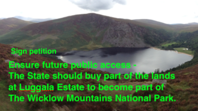 The Department of Culture Heritage and The Gaeltacht have stated that the price tag of €28 million is too high. Instead we are asking that the State purchase the portion of the lands which have traditionally been open to the public for perhaps €1.2 million based on the price paid by the state for a similar parcel of land in Glenasmole in the Dublin Mountains in 2016. It is vital that the Iconic and much cherished landscape and lands of Luggala estate remain open to the public.