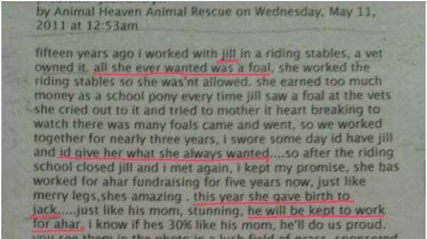Read the underlined sections first to get the general gist of this story. In 2010 Suzanne Gibbons put a mare in foal that would have been 23 years old at the time. In general, as a blatantly obvious rule, rescues don't breed animals. Especially not a 23 year old mare!