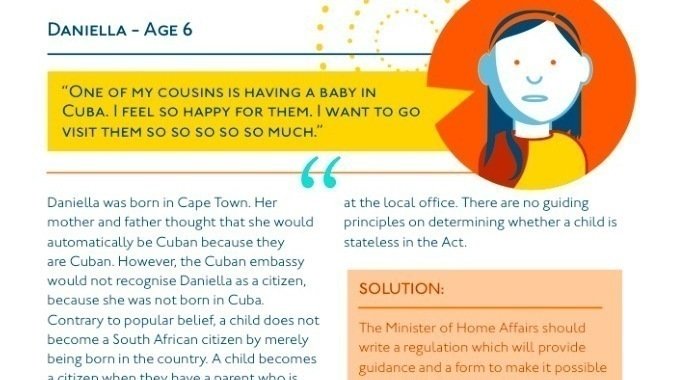 The Supreme Court of Appeal will decide on Daniella's case next week! Daniella is a stateless child born in South Africa. Follow us on Twitter on Tuesday 6 September for updates. Daniella's story is on page 2 of Childhood Statelessness in South Africa (pictured) Follow this link: http://www.lhr.org.za/publications/childhood-statelessness-south-africa
