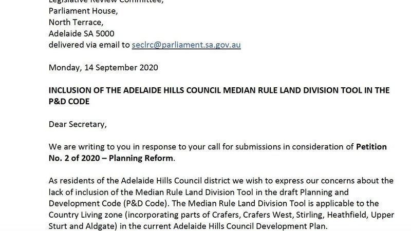 Back in September as a result of another major petition presented to the SA State Parliament, the Legislative Review Committee of parliament conducted an enquiry into the new planning rules. Cr Leith Mudge and Cr Kirrilee Boyd (the originators of this petition) made a submission to the committee relating to the inclusion of the Adelaide Hills Council Median Rule Land Division Tool in the P&D Code. Here is the text of the submission: