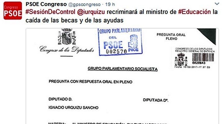 La petición de firmas #SinBecaSinFuturo llegará a la Sesión de Control del Congreso de los Diputados el próximo miércoles gracias al PSOE. El diputado socialista Ignacio Urquizu será el encargado de presentar al Ministro de Educación el deseo de miles de estudiantes españoles de cambiar el precario sistema de becas de nuestro país.