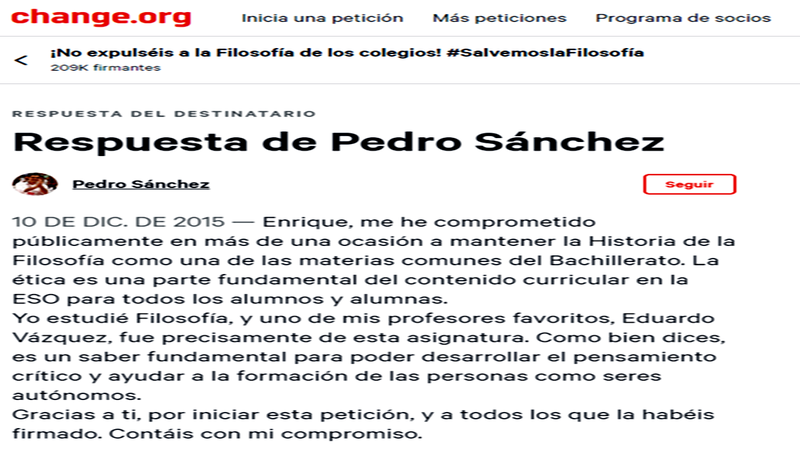 Sabemos que hay cosas más urgentes, pero no queremos que se olvide que Pedro Sánchez nos apoyó totalmente en nuestra petición de Change.org para que Ética vuelva a ser obligatoria en 4º de ESO e Historia de la Filosofía en 2º de Bachillerato.
